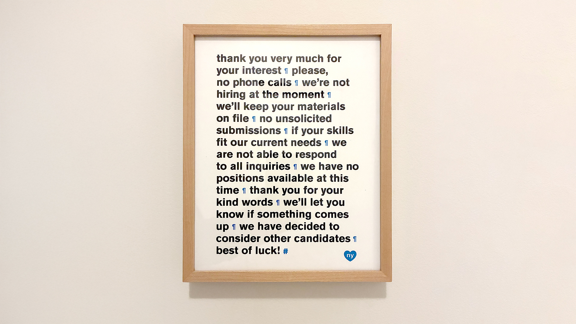 Best of Luck! 2-color serigraph, 2011. A sampling of the responses I received while looking for work right after moving to New York. 2008 was a hell of a year.